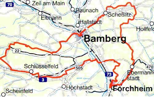 Der an Sehenswürdigkeiten reiche Radweg führt durch die oberfränkischen Städte und Ortschaften Bamberg - Scheßlitz - Heiligenstadt - Forchheim - Schlüsselfeld und Ebrach. 204 Kilometer mit 1100 Höhenmeter, die in 3-4 Tagen locker erradelt werden kann. Auf der Strecke liegen zahlreiche bischöfliche Herrensitze mit zahlreichen kulturellen Schätzen.